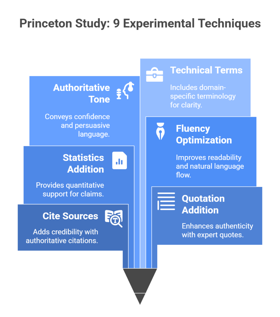 The Princeton-led GEO study identified nine specific techniques that demonstrably improve visibility in generative engine responses. Let’s examine the most impactful methods.
