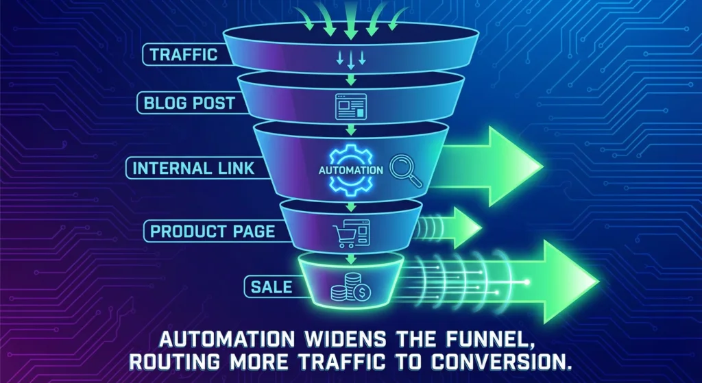 - Internal linking distributes power – Smart site architecture helps both users and search engines. Breadcrumbs, navigation, and contextual linking pass authority to your revenue pages.
